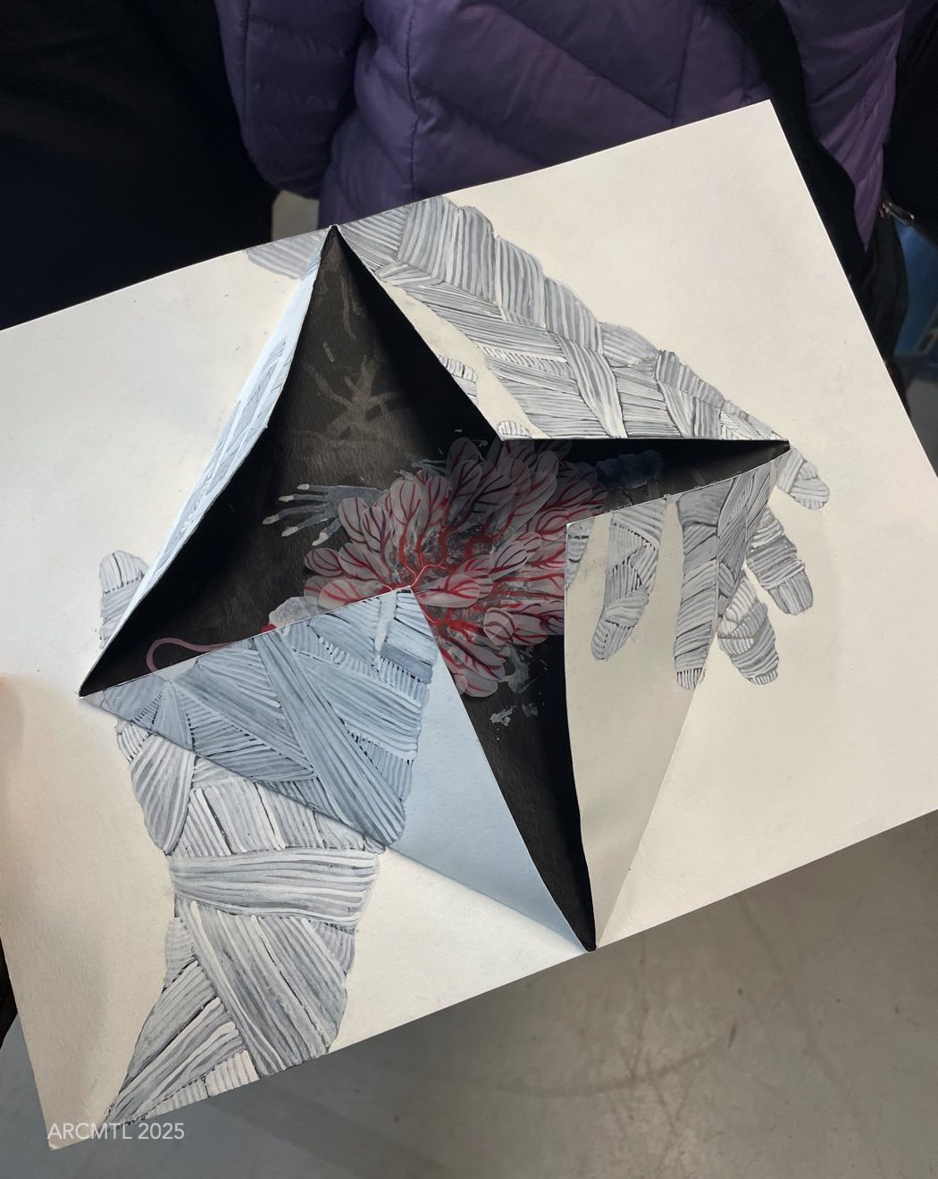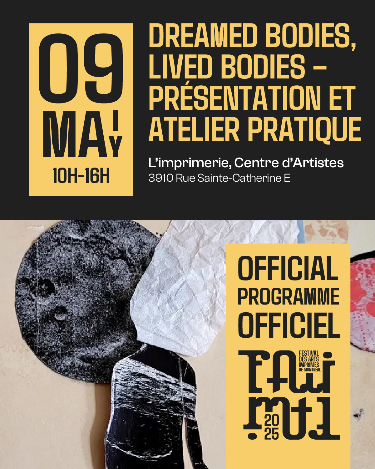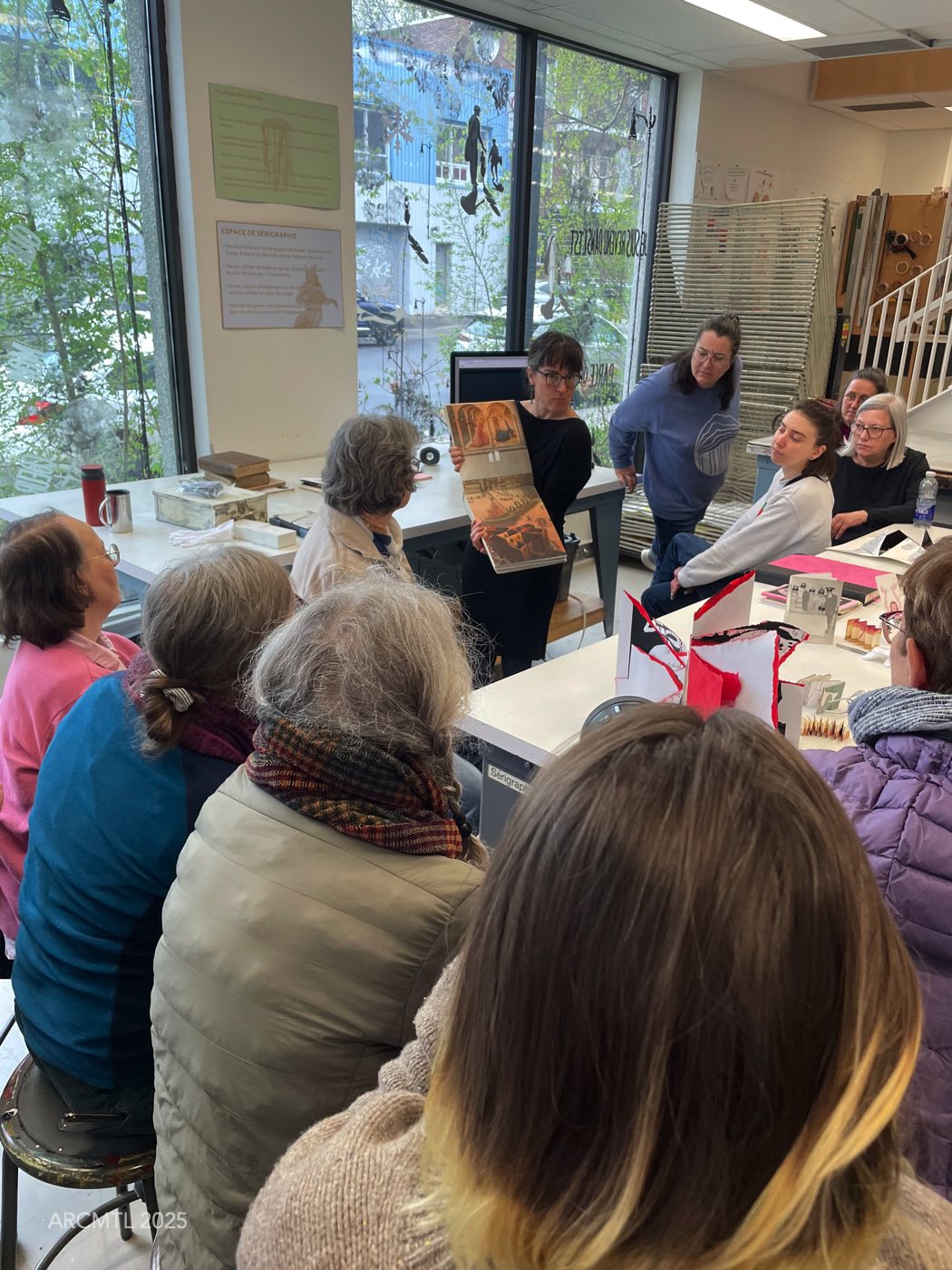 Le 8 mai, L’imprimerie a invité le public à découvrir les recherches menées en cocréation par Caroline Boileau et Adeline Rognon lors de leur résidence d’artiste. Sous le titre Corps rêvés, corps vécus, elles ont explorer la relation entre le corps et la mémoire à travers le papier, expérimentant diverses formes telles que la reliure, le livre sculptural et les pliages en 3D. La discussion portait sur les motivations et les sources d’inspiration derrière le travail de création des artistes, ainsi que sur le processus conceptuel lié à la tenue d’un journal ou carnet de dessin, et sur l’importance de l’observation et de l’expérimentation dans la pratique artistique.