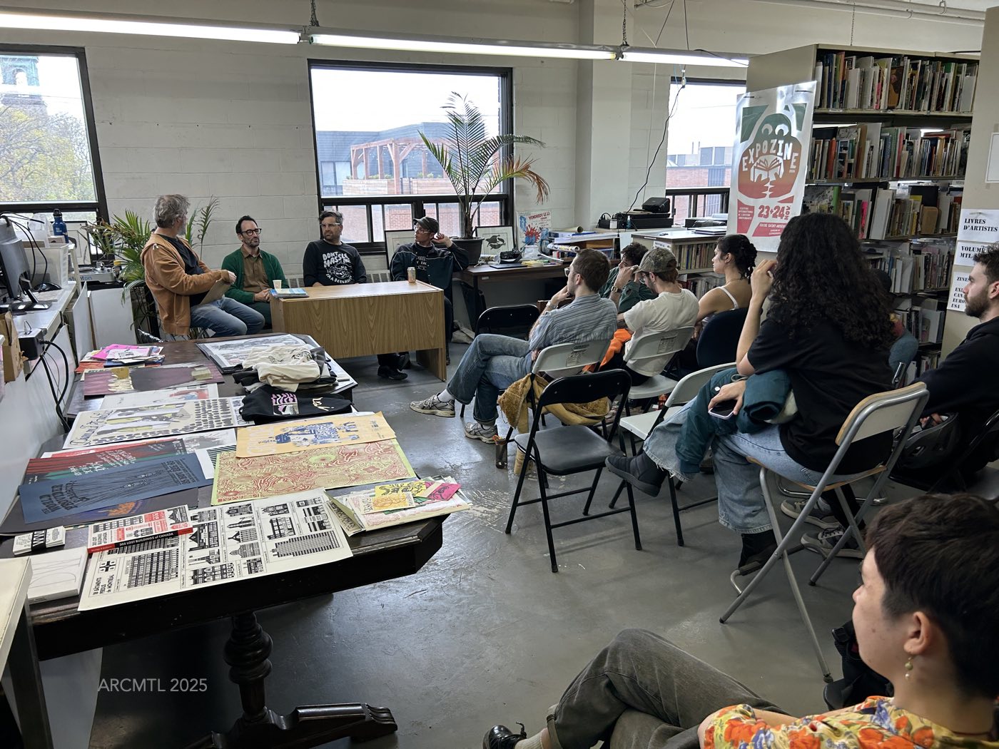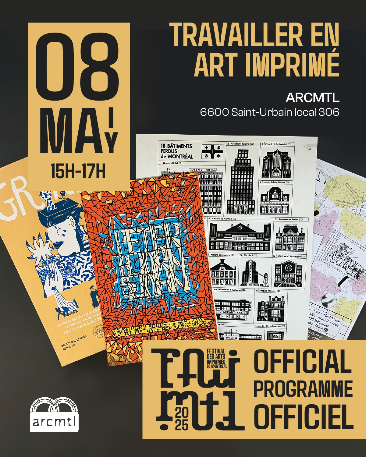Animée par Billy Mavreas, affichiste et artiste montréalais de longue date, Travailler en art imprimé était une discussion entre trois artistes locaux travaillant dans le domaine de l’impression qui ont réussi à vivre de cette pratique et de la vente d’œuvres d’art. JG (Material Group), Ray Biesinger et Todd Stewart ont discuté des motivations derrière leur travail et des enjeux liés à vouloir vivre de leur pratique tout en appréhendant les burnout. Ils ont échangé sur des façons pour les artistes travaillant dans le domaine de l’impression de se bâtir une carrière dans l’âge numérique. La discussion fut suivie une présentation d’œuvres imprimées de chaque artiste, sélectionnées dans les archives d’ARCMTL. La discussion fut enregistrée en direct et es disponible en baladodiffusion.